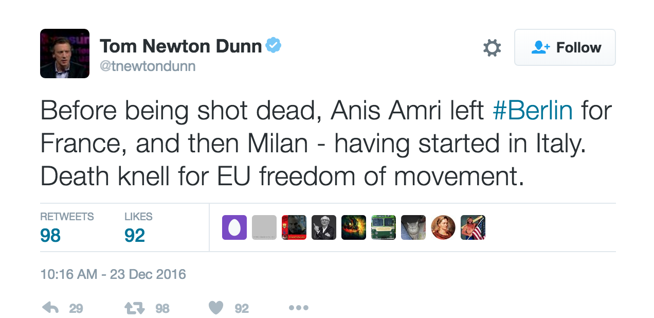 After the suspect in the Berlin Christmas Market truck attack, Anis Amri, was shot dead by Police in Milan - resorting to drawing a gun when asked for ID was a bit of a give-away - the fact that he had managed to leave Germany and travel via France to Italy was used by Newton Dunn to show that the Sun was right about, er, something. “Before being shot dead, Anis Amri left #Berlin for France, and then Milan - having started in Italy. Death knell for EU freedom of movement” he declared, going wrong as he did so.