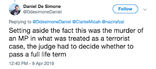 As to Hitchens’ consideration of the evidence, “Your blog also says ‘most of the evidence was eyewitness accounts of the crime, and reports of the fruits of searching Mair’s miserable home’ … In fact, also central was evidence that Mair used the internet to research Jo Cox and how to kill, as well as his firearm and his ammunition … He had illegally acquired the firearm - how has still never been established - and he made some effort to plan his attack and escape”. And the political aspect of the case?