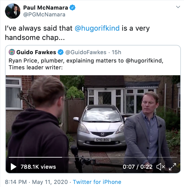 Those out there on the pro-Tory Brexiteer right found a new hero yesterday evening, as plumber Ryan Price appeared on Channel 4 News and defended the lockdown-easing proclamation of alleged Prime Minister Alexander Boris de Pfeffel Johnson to the hilt. “‘Be sensible... What do you want? A full handbook to tell you what to do?’ Plumber Ryan Price says the government guidance on returning to work is clear enough for the public”.