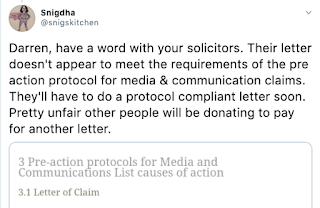 But here a problem entered, as one enterprising Tweeter pointed out. “Darren, have a word with your solicitors. Their letter doesn't appear to meet the requirements of the pre action protocol for media & communication claims. They'll have to do a protocol compliant letter soon. Pretty unfair other people will be donating to pay for another letter”. Whoops!
